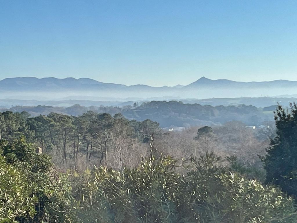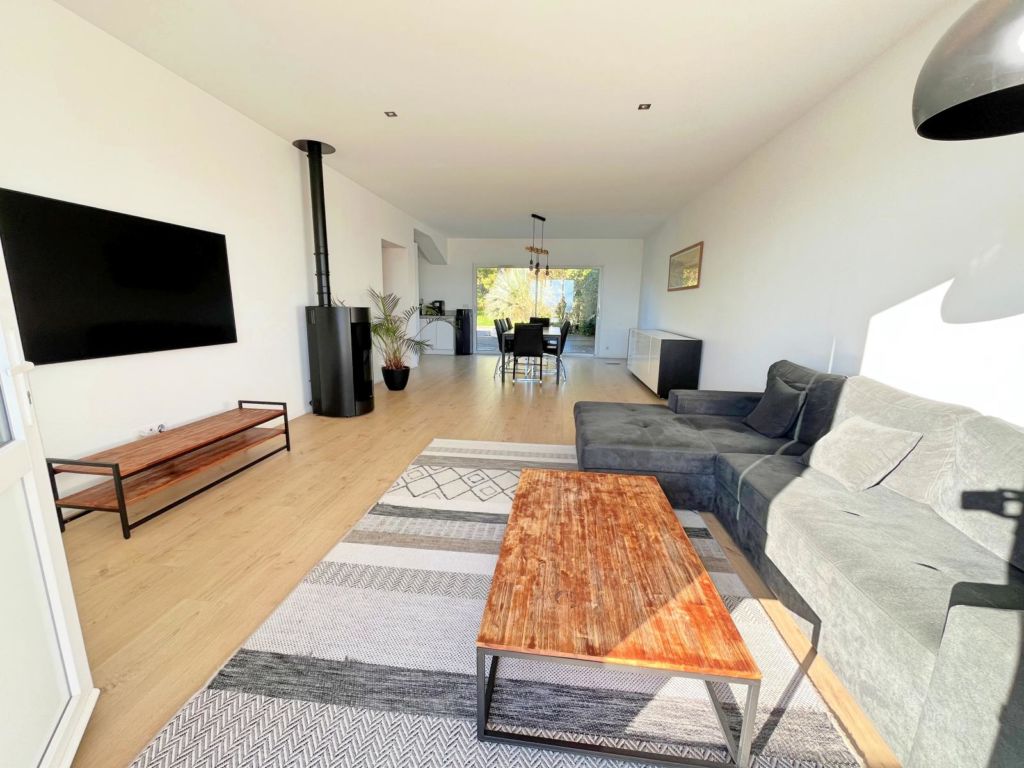 Grand salon traversant avec poêle, vue sur les Pyrénées, terrasse et jardin.